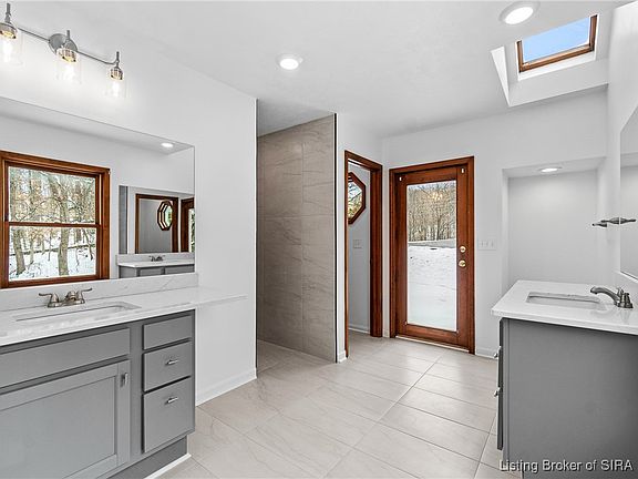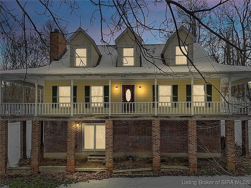 Welcome to this beautifully updated 3-bedroom, 4-bath home offering nearly 3,000 square feet of finished living space, situated on 4.475 partially wooded acres in the highly sought-after Floyd Central School District. This property delivers a rare blend of space, privacy, and modern upgrades. Inside, the home features new flooring throughout, fresh paint, and updated light fixtures, along with nicely renovated bathrooms. The primary bathroom includes a tile walk-in shower and dual vanities, while the remaining bathrooms have been tastefully updated with new vanities and finishes. The kitchen has been upgraded with new granite countertops and cabinetry, complementing the home’s beautiful wood trim and inviting living spaces. A striking stone fireplace serves as a focal point on the main level. The first-floor primary suite offers convenience and comfort and features French doors that add architectural charm. The finished basement expands the living space with a recreational area, full bathroom, and decorative wood-burning stove, providing flexibility for entertaining, hobbies, or relaxation. Outdoor highlights include a wrap-around porch overlooking the partially wooded acreage, along with a detached 2-car garage and a barn for storage or additional uses. Move-in ready and full of character, this home offers space, updates, and an exceptional setting—just minutes from Floyd Central schools and Southern Indiana amenities.