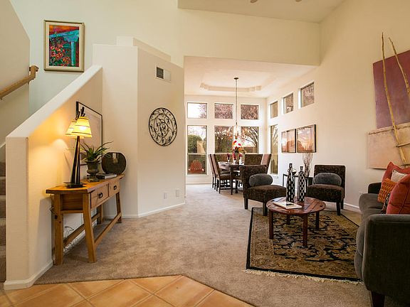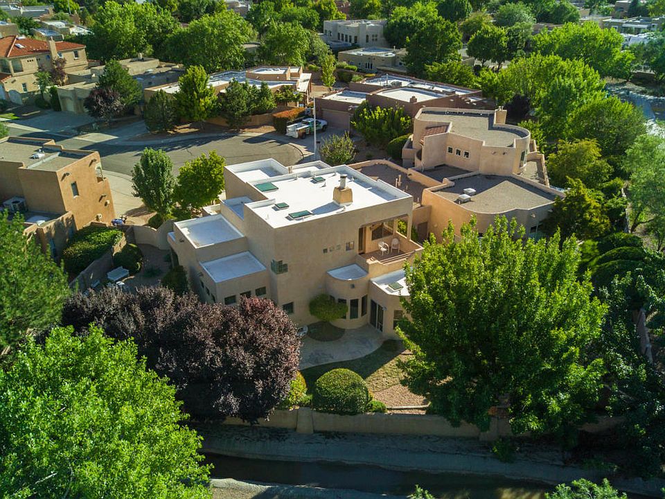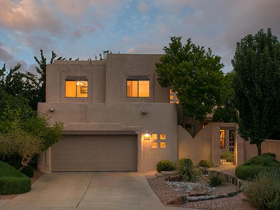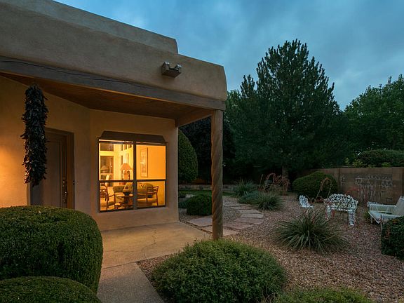 Nestled into the back of a cul de sac in the North Valley community of The Meadows,this lovely Pueblo style home built by SunnQuality boasts 2,800 square feet with 4 bedrooms & 3 baths. New carpet and new paint! You will be greeted by a charming entry courtyard that wraps around to the backyard, great for entertaining. The home has with TONS of light, windows and skylights and a wonderful enclosed sunroom. The master boasts a spacious balcony perfect for morning coffee and listening to the birds sing. Home is next to the community park, with new stucco and a new membrane roof.A great location close to the Co-Op for shopping & convenient to freeways & Downtown,a quick drive to Albuquerque Country Club & it is a quick walk to the Bosque trails. Don't miss the VIRTUAL tour.