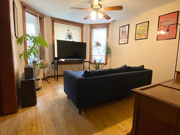 Environmentally Quiet/Friendly (see below) Ukrainian Village Condo. Rice and Western 1 block east of Chicago. Walking distance to CTA and Metro. First Floor Front Unit With Lots of windows in leaving room that allows Lots of Sunlight, Den, Huge Backyard, Central Air Conditioning, Gas Forced Heat, Storage Closet, Laundry in Unit, Dishwasher, Refrigerator, Gas Stove, Oven. Hardwood Floors, Tiles, Cable Ready, Ceiling Fans, Vintage. Street Parking. Garage Parking only 1 Spot is Available for Additional $150/mo Water is included Non-refundable moving fee $600