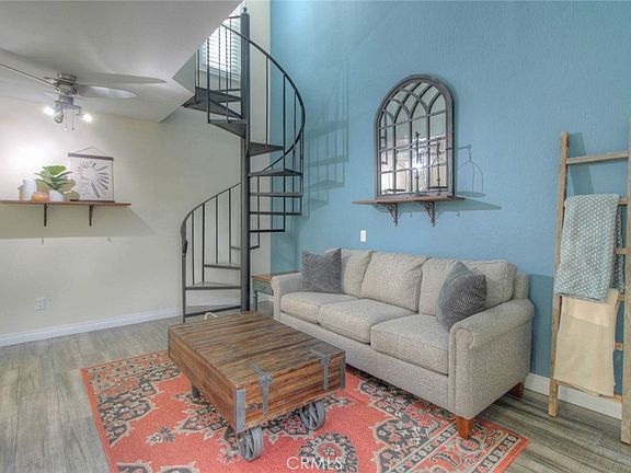 PRIDE OF OWNERSHIP shows in this stunning 1 bedroom/1.5 bathroom end unit! This two story condo located in Las Palmas Mission Viejo Condo Association, features: a private outdoor patio; ceramic tile flooring throughout first floor, bathrooms, and staircase; guest bathroom on first floor; central A/C; newer double-pane windows; and in-unit laundry! The kitchen boasts granite countertops, glass tile backsplash, white cabinets, and stainless steel appliances. Access the spacious loft-style primary bedroom via the elegant spiral staircase; hardwood floors finish out the 2nd floor. Primary bathroom includes open concept 2 sink vanity, private shower/tub and toilet, and two large closets with mirrored sliding doors. The patio was upgraded with hardwood decking and a double-pane sliding door as well! Additional property highlights: No one above or below, first floor entry, and detached carport parking just around the corner with storage locker. Community includes: swimming pools, spa, and access to Lake Mission Viejo Association amenities. Close to shops, restaurants, and just 7 minutes from the 5 FWY!