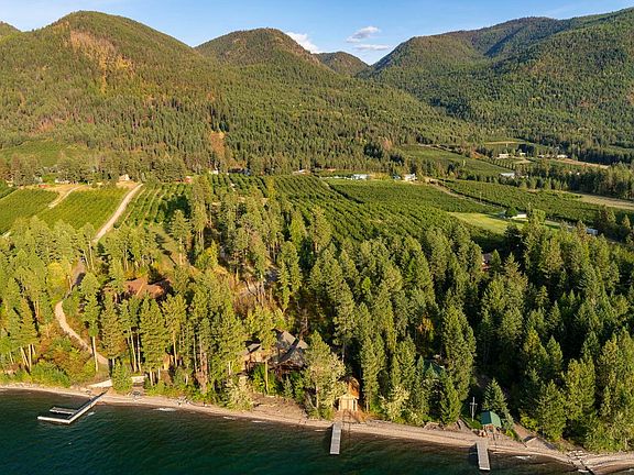 Along the east shore of Flathead Lake, just north of Yellow Bay, is this beautifully designed lake home. The driveway winds through the operating cherry orchard, past the 2 bdrm, 1 bath 1933 guest farmhouse, to the 3 bdrm + loft, 4.5 bath main home. The moment you enter the main residence, you are captivated by the panoramic lake views, perfectly framed within the wall of windows. This home offers an oversized kitchen with huge island for gathering, gorgeous dining and great room with rock fireplace, along with screened-in porch, full family/game room on lower, walk-out area + 2 guest suites and ample storage rooms. Or, if you are ready to enjoy the water, the 220 ft of frontage has a cabana & dock with lift station. Plus, there is 30' x 40' storage building & 2 smaller ones. Surface Water: Flathead Lake