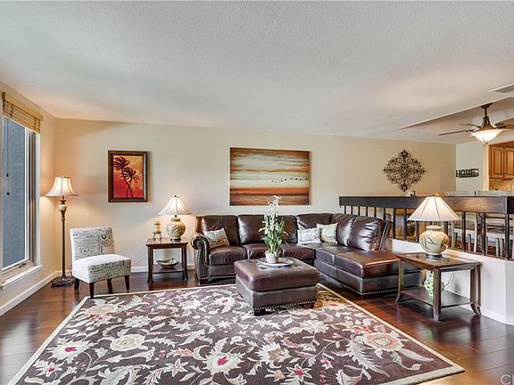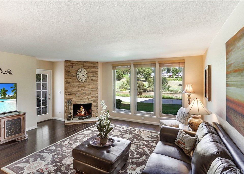 Stunning Remodeled single level property with golf course views in Finisterra on the Green gated community. Beautiful hardwood floors throughout living areas, stone floors in kitchen and upgraded carpet in the bedrooms. Kitchen is remodeled with stainless steel appliances, granite counter tops, walnut cabinetry with built-in wine rack, tumbled stone backsplash and an eat-in nook. Kitchen opens to dining room with serving bar. Oversized family room with hardwood floors, stack stone gas fireplace and large windows looking onto the golf course. Step outside the french door onto the private patio to dine al fresco. Master Bedroom also has a golf course view and includes a sliding door to the patio and overhead ceiling fan with remote. The ensuite master bath is completely remodeled with white quartz counters and huge walk-in closet plus privacy toilet and shower area including walk-in shower with frameless glass door, floor to ceiling white subway tile and mosaic glass surround and tile floors Secondary bedroom and bath are down short hallway with built-in linen storage. Secondary bathroom has granite counters, large framed mirror, shower/tub combo and tiled floor. All new Anderson windows installed throughout! The community was just epoxy piped and repainted. Detached 1 car garage and 1 assigned carport. Finisterra is gated and includes a community pool and spa plus strolling path fronting the golf course. Lake privileges are also included at Lake Mission Viejo.