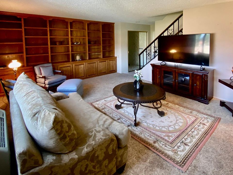 Furnished Rental. This condo is in 55+ community. Walking distance from golf course. Available now for 6+ months. Excellent and one of best location in the Village, La Jolla Model, 3 bedrooms and 3 baths Condominium .Upstairs has 2 large Master bedrooms, each with it's own bathroom, walk in closets and plenty of sunshine from their large windows. Stairlift available on request. Downstairs has a large living room with custom oak bookshelves on one wall, 65" TV, a nice dining room with large outdoor balcony and a remodeled kitchen with granite counter tops and custom cabinets. The down stair bedroom is being used as a den or office has sliding glass door leading to a private patio and is adjacent to a full bath. Parking in your carport is just steps from your front door as well as community laundry room . Building exterior is nicely landscaped . Laguna Woods is a very active 55+ gate guarded community with golf course and a beautiful Clubhouse, tennis courts, swimming pools, 7 club houses, stables and countless clubs to join. There is an internal free bus system, close to the ocean, malls, grocery stores, churches and medical facilities. It is a unique City with everything you need