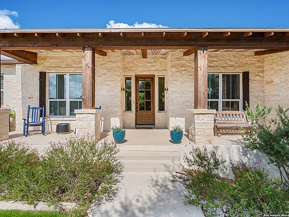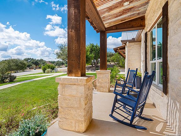 Set atop the hills of Mountain Springs Ranch, this home captures sweeping Hill Country views across 1.33 acres. A stone facade and broad porch introduce interiors designed with artisanal detail and ease of living. The vaulted living room rises beneath timber beams with hardwood floors leading to the beautiful woodburning fireplace crowned by a handmade mesquite mantle. In the kitchen, a mesquite island pairs with crema marfil leather marble counters quarried in Spain, connecting easily to dining and gathering spaces with views of the surrounding landscape. The primary suite is generously scaled with a private bath including Saltillo tile floors, dual vanities, a walk-in shower, and a clawfoot tub set beside sunlit windows. The plan also includes a formal dining room, private study, and a secluded den that extends the home's versatility. Outdoors, a fenced yard sits within the larger acreage, while porches finished with patina-aged corrugated metal ceilings take in long views and evening breezes. Residents enjoy access to a three-pool complex, an 85-acre nature preserve with miles of trails, and a community pond, all within reach of San Antonio.