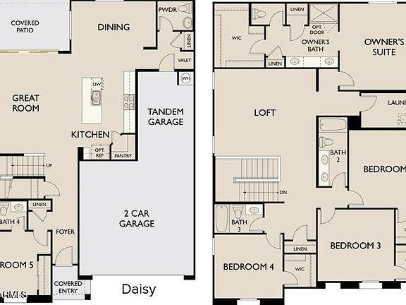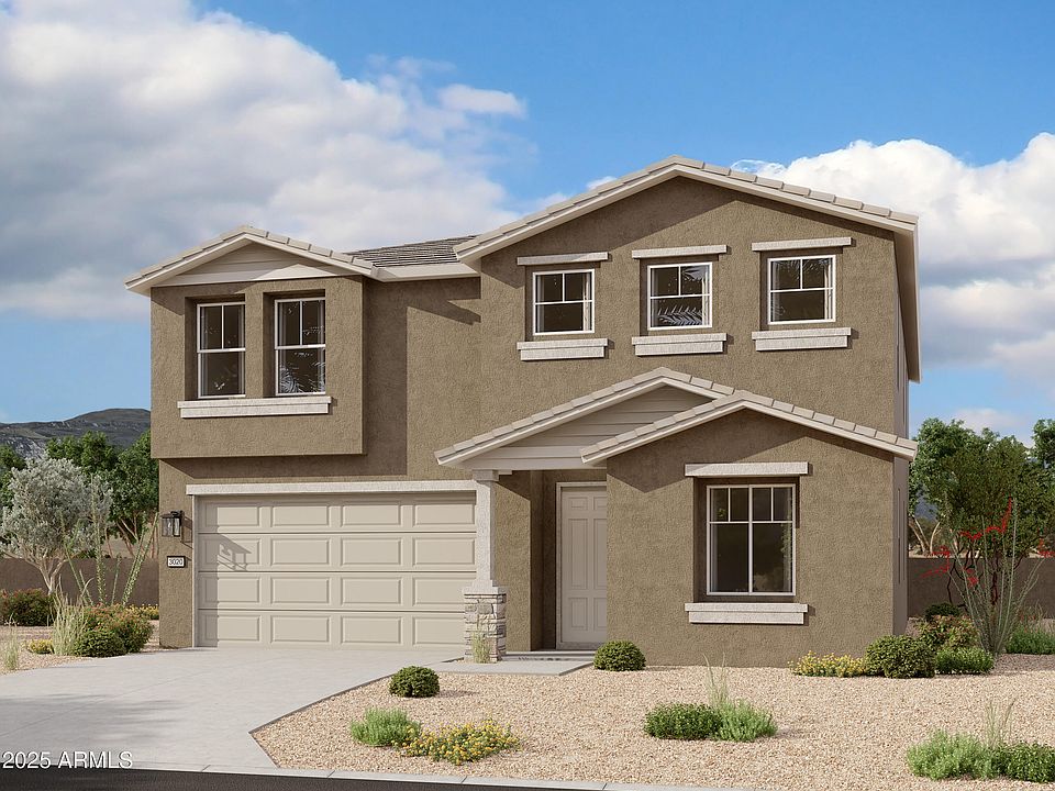 Nestled in the highly sought-after city of San Tan Valley, this impressive two-story home spans 2,988 square feet and boasts 5 bedrooms, 4.5 bathrooms, a spacious loft, and a 3-car tandem garage. Upon entering, you'll find a bedroom and a full bath and the great room, illuminated by a large 4-panel sliding glass door, brightens the dining nook and kitchen. As part of the Oxford Collection, this home features 42'' upper dark brown shaker cabinets, quartz countertops, a matching backsplash, and stainless steel appliances. Additional amenities include a rough-in for a soft water loop, as well as a washer, dryer, fridge, and blinds throughout. Upstairs, the expansive primary suite offers a large walk-in closet, double sinks, and a linen closet, while the generously sized laundry room is conveniently located off the large loft. Each of the remaining bedrooms has its own walk-in closet and shares two full bathrooms. The spacious backyard provides plenty of room for a pool and more. Wales Ranch community amenities include parks, pickleball, basketball courts, a lake, and beautiful paths with breathtaking views.