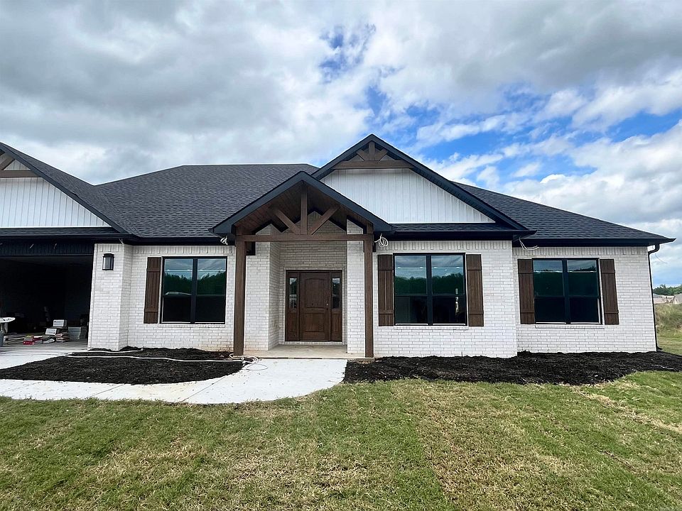 Welcome to your dream home on the lake! This brand-new construction has contemporary elegance & thoughtful design, offering the perfect blend of comfort and style. As you step inside, you're greeted by an expansive open floor plan that effortlessly combines the living, dining or office, and kitchen areas, creating a seamless flow for everyday living and entertaining. The heart of the home, the kitchen, features a sleek breakfast bar, corner pantry, custom cabinets, stainless steel appliances, & granite countertops. The living room is the epitome of relaxation, centered around a corner electric fireplace. This home offers four spacious bedrooms, providing ample space for the whole family or guests. The master bedroom is a true retreat with tray ceiling, his and hers closets. It boasts a luxurious ensuite bathroom complete with a corner spa tub, his and hers vanities, and a huge tile shower with double shower heads. The exterior of the home will have a black roof with black trim, white brick, & cedar gables. Approximate completion date is mid July. Call to see today!
