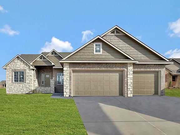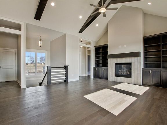Exquisite craftsmanship throughout. Check out the wood-crossed beamsin 15 foot vaulted ceilings. Beautiful custom wet bar, 6 inch base trim throughout the entire residence. Enjoy the lake view lot off the covered deck. Basement includes 9 foot ceilings, storm shelter, and walk-out. Builder has included upgraded HVAC system & hot water tank, a value of about $3900. Price includes sprinkler system, well and sod.