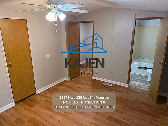 -No Section 8 -No Pets -No rent to own -No smoking inside -Rent is $700.00 -Deposit is $560.00 -Income will be verified on each tenant. -Central Heat and AC. -Located at 2337 Hwy 139 Lot 34 (Swartz) -Stove and Dishwasher Included. -3 bedroom 2 bath mobile home. -You pay utilities (water, electric) -We pay Lawncare and trash service. -Home is all electric. -Washer and Dryer connections. -$50 application fee per adult.