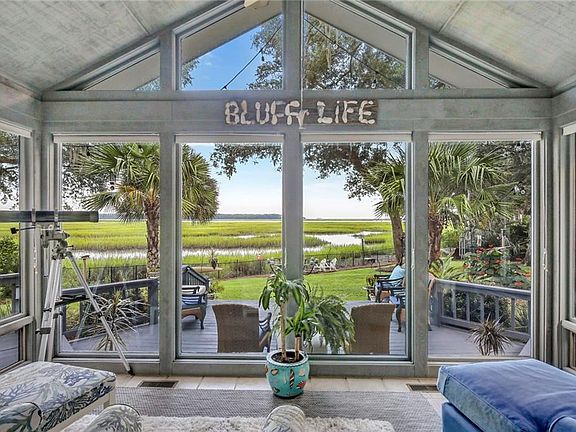 New to remote working?? How about this office view overlooking the Julienton River! Nestled under a Live Oak canopy, this updated home is move-in ready and set up for Coastal living! Large picture windows make the views the focal point of this home. Featuring a large living room area, wood burning tabby fireplace and a sun room that opens up to the decks and fenced backyard complete a fire pit. New landscaping and outdoor lighting. The kitchen has been fully updated with LG appliances, granite countertops and tile backsplash. Three bedrooms and two baths and all on one level make this house exceptionally functional! For added space, bedroom 2/Office has a built in Murphy bed. Located in Sutherland Bluff Plantation which features a community swimming pool, clubhouse, fitness center/spa, tennis courts and boat dock on the Sapelo River. The home sits directly across from hole #10 on Sapelo Hammock Golf course. New roof and many other updates!! No flood insurance required.