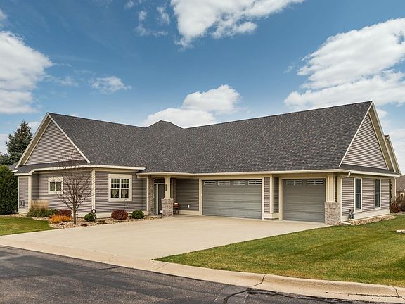 Well maintained slab on grade villa, located in SW Rochester's Fieldstone subdivision offering 2 spacious bedrooms, 2 baths and 30x35 heated and finished 3 car garage. Great open floor plan with kitchen, dining and living room showing off 9 and 10 ft ceilings, nice size kitchen island with pantry, great natural lighting throughout, cozy gas fireplace and just steps to the back private patio. The primary bedroom is large with nice walk-in closet, and 3/4 tiled bathroom. There is a 2nd bedroom with a full bathroom to accommodate. The laundry/mudroom has great space with cabinets, sink, built-in bench, closet and walks out to the huge garage. Impressive villa inside and out, with a serene location!