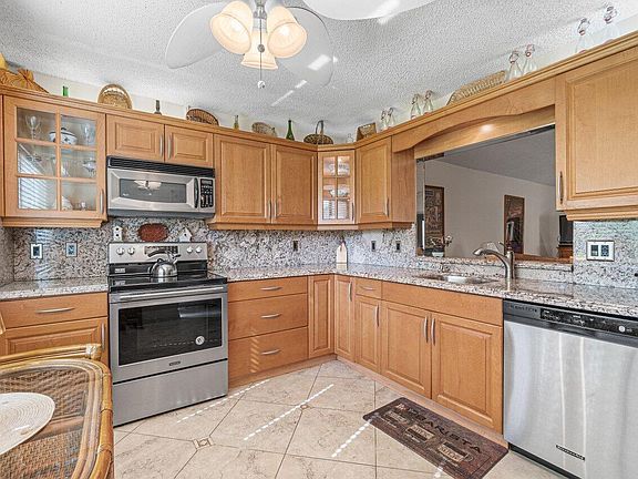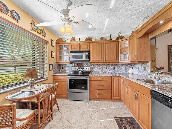 Live the Florida lifestyle in this beautifuly maintained 2 bedroom 2 bathroom corner unit villa in Lakes of Boca Barwood.This Amour villa is the largest & boasts updated wood kitchen cabinets with granite countertops and stainless steel appliances. Newer ceramic floor tile throughout. Split bedroom plan with sliders leading you out to an oversized screened in patio. Walk in laundry and storage room. Open living space with natural sunlight flowing through. Valuted ceilings with recess lighting. Primary room boasts walk in custom California Closet, high ceilings, and double sink bathroom vanity. Active pet friendly community has resort pool area, tennis, and jogging paths overlooking senic lake views. Close to shopping, restaurants, turnpike, 95 and entertainment. Covered parking space