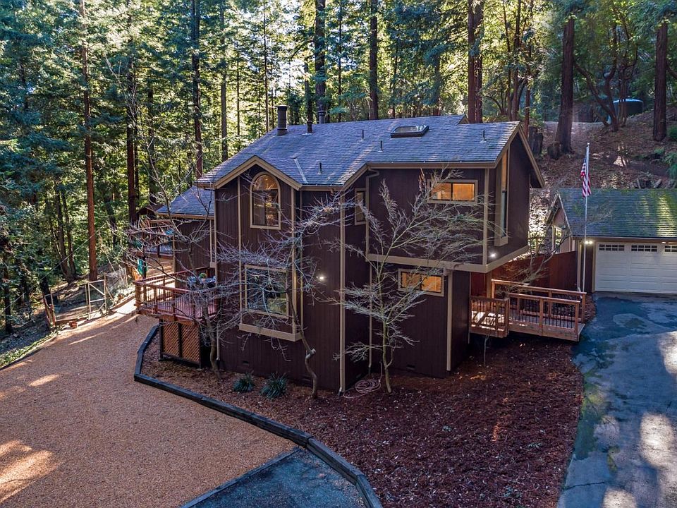 Welcome to this Highest Quality Meticulous Mehus Built Home Set amongst Stunning Redwoods, Privacy + Serenity + Walking Distance, via Private Trail, to Award Winning Building Blocks Preschool, Loma Prieta Elementary, CT English Middle Schools. 1st Floor Bed/Bath w/Cozy Fireplace, Newly Constructed Deck, +Large Bonus Room w/ Nook Perfect for Homework, Office or Game Play. Exposed Beam Kitchen w/ Over Sink Forrest View, Wood Burning Stove, Open Dining/Living Room w/ Skylight + Windows on All Sides - Nature and Starlight Tumble in. New Custom Ipe Wood Deck off Living Room for Fantastic Outdoor Dining and Entertaining Experiences. Kids + Kids at Heart Love Playing on the Professional Play Structure w/ Ladders, Swings, Slides, Tree House, Zip Line. Fenced Garden Area. 2 Car Garage w/ Work Bench. Plenty Flat Off Street Parking. High Speed Internet. Secret Trails to Historical Features, Hiking, Biking, Fishing. Walk to School, Store, Wineries, and Houses of Worship. Award Winning LG/Sar High