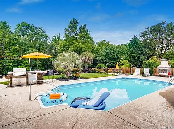 A stay-cation close to everything! Beautifully updated, impeccably maintained ranch home in Brightmoor in Matthews. All hardwoods throughout, plus renovated kitchen & baths. Kitchen w/soft close, cherry cabinets, extra lighting, granite tops. This home also has 2 family/gathering rooms, and the bedrooms are spacious. The in-ground pool (salt-water) and 2-car detached garage/party room will make your place the place to be! Check out the lush landscaping, including palm trees and beautiful flower beds, stone firepit with seating area, extra (wired) storage building with an extended, covered deck built onto the back of the "she-shed" (approx. 20'x16' outbuilding, perfect for storage, workshop, or pool equipment). Detached garage can be used as a garage or as a party room (complete with bar, and is heated). Windows & HVAC (including all ductwork) is 6 years old. All fenced yard, backs up to nature/common area.