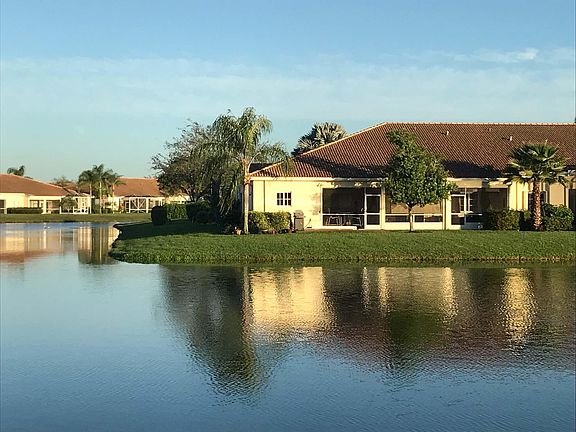 Wow! Beautiful villa overlooking the lake. Impeccable taste shows with the sunny, inviting decor of this cute villa. Super clean, gently used home owned by snowbirds. As soon as you walk in the door you are greeted by the amazing lake view. This 2 bedrooms, 2 bathrooms and a den/flex space, nice kitchen, light, bright colors make this home feel like a coastal beach house. AC is 2019, hot water heater 2022, accordion shutters, beautiful glass etched front door, upgraded diagonal tile, kitchen cabinets and newer ceiling fans and custom master closet. HOA fee includes high speed internet, premium cable channels, ADT home alarm and phone, exterior paint, lawn maintenance, pressure washing, recently mulched and use of all the amenities, which include resistance pool, family pool Adult lap pool, jacuzzi, pickleball, bocce, tennis, shuffleboard, water aerobics, fitness center, yoga/Zumba room, card rooms, billiards, bingo, ballroom, shows and so many more activities! Come enjoy the amazing lifestyle you deserve!!! It's like being at a resort every day at a fraction of the cost. Oh! This home comes with all the beautiful furniture/turnkey you see or it can be purchased unfurnished.