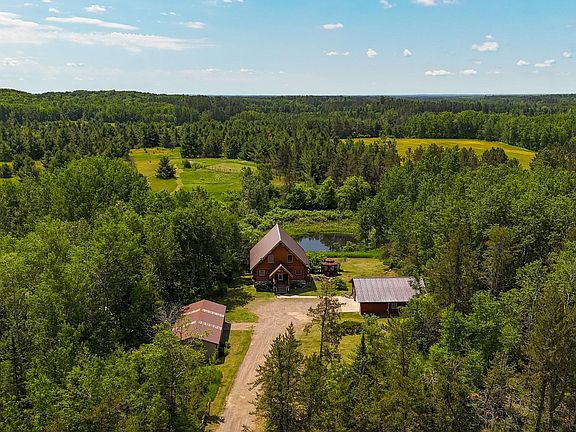 ***Offer deadline Sunday June 29 at 8 am*** Tranquil Norway Pine Log Home Retreat on 10 Private Acres. Beautifully built log home with stone nestled on 10 private acres featuring a serene pond and winding trails throughout the property. Inside, the home boasts trapezoid windows framing stunning landscape views. Large living room space with gas fireplace for cozy warmth on snow days. Main level laundry, a 1/2 bath, with bright, open living spaces. AC mini-split to cool your summer days. The upper-level primary bedroom ensuite with 3/4 bath features a walk-in closet and multiple additional closets. The upper level also features a private office space—ideal for remote work or a quiet retreat, extra storage and panoramic views. The walkout basement includes two bedrooms, rec room, utility room and a full bath. This home offers a 28x34 heated garage with in-floor propane heat and a space previously used as a bedroom with built-in storage, utility room, and cabinetry for added functionality. A spacious 21 x 44 pole building with slab provides storage for your extra toys or previously an indoor hockey rink area. Plus a separate storage shed and charming playhouse on-site. Relax in the gazebo overlooking the pond, surrounded by the sounds of birds and nature. Spend your summers grilling on the deck, playing yard games or walking your trails. Spend your winters skating the pond lit from the gazebo or snowshoeing the trails. Let your dog run free with large invisible fencing throughout property. This one-of-a-kind property must be seen to truly appreciate the peaceful setting and quality craftsmanship. Looking for another bedroom or a main level bedroom? The seller had designed the home to add an additional bedroom on the main level where the second living room area is.