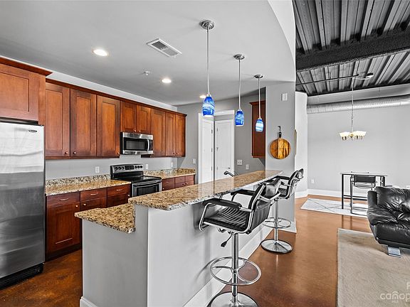 ***Seller offering $5,000 towards rate buy down with acceptable offer***Located in the heart of NoDa at desirable 28th Row, this 1 bedroom/1 bath condo is surrounded by incredible restaurants, live music venues, craft breweries, eclectic shops, & gyms. Easy access to the Lynx Blue Line light rail and public transportation, making it simple to explore all Charlotte has to offer. This condo boasts a sleek & stylish modern industrial aesthetic, w/ natural light, high ceilings, stained concrete floors, & exposed ductwork. Large kitchen with ss appliances, granite countertops, ample cabinet/counter space & bar seating. Spacious bedroom w/ walk-in closet, dining area, open living room, built-in computer niche perfect for working from home, & a private balcony. The building offers secure entry & a dedicated parking space. Ample street parking. New HVAC 2020. Refrigerator, washer and dryer convey. This condo presents an excellent investment opportunity with NoDa's popularity and growth.
