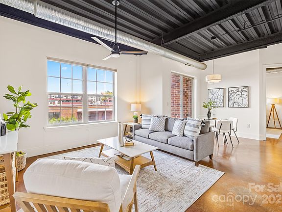 Feels like a brand new space! Thoughtfully updated with fresh paint, all-new lighting, and brand new appliances. This 2-bedroom, 2-bath condo places you in the heart of NoDa, just moments from Rhino Market, galleries, and restaurants. Soak in city skyline views and glowing sunsets from your private west-facing balcony and Juliet balcony off the main bedroom. Industrial-style charm flows throughout with 12’ exposed ceilings, polished concrete floors, and solid 8’ doors for added privacy. Both bedrooms boast professionally reimagined walk-in closets offering generous storage. The kitchen features granite counters, stainless appliances, modern cabinetry, and a spacious bar for casual dining or entertaining. Custom lighting fixtures bring a sleek, designer finish. This secure-access building offers peace of mind, and this unit includes a rare, premium parking spot just steps from the entrance. A perfect blend of style, function, and unbeatable location.