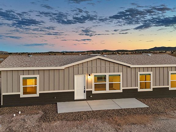 Brand New 4 Bed, 2 Bath on 4.09 Acres!Stunning views, no HOA, and room for animals. Spacious open floorplan with 9' ceilings, elegant finishes, and quality upgrades. Ground-set on block stem wall for durability and seamless entry. Stylish kitchen with stainless appliances and farmhouse sink. Energy-efficient design with architectural shingles and ceiling fans throughout. Private 50 GPM well ensures reliable water. Large front & back patios for entertaining or relaxing. Rural tranquility with modern amenities, close to Prescott & Chino Valley. Includes a 1-Year Home Warranty for peace of mind!