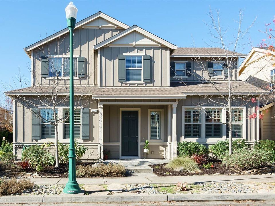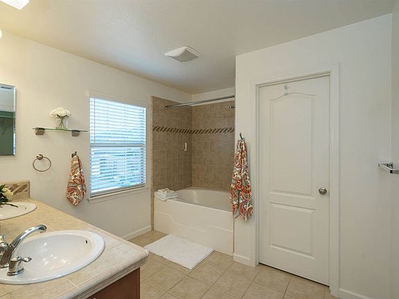 Fantastic Woodbridge Subdivision home. Near acre sport park, walking path. Eat in kitchen tile granite counter tops, lots of storage and island. Newer SS refrigerator included. Living room with gas burning fireplace, plantation shutters. Second floor feature all bedrooms, laundry room with appliances. Hallway is light and bright with plenty of storage. Main suite features ceiling fan for warm days. Main bath with soaking tub, dual sink custom designed walk-in closet is located in the bath dressing area. Garage has built in cabinets plus an additional spacious storage closet. Conveniently located near schools, freeways, biking and walking paths. Landscaping freshened up. Low maintenance rear patio with sun shade and some areas for your green thumb. Solar is owned.