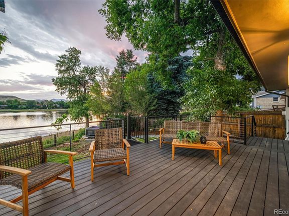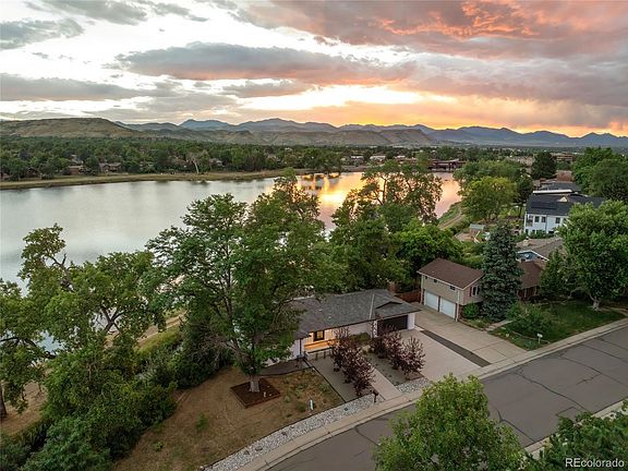 Admire unobstructed mountain and water views from this stunning Applewood residence. Situated directly on the Maple Grove Reservoir, this home offers a rare opportunity in a coveted locale. Meticulous updates surface throughout a gracefully flowing layout bathed in an abundance of natural light from expansive windows. A cozy fireplace warms the living area as a dining area with a built-in bench invites vibrant gatherings. The sleek kitchen flaunts generous cabinetry and a peninsula with seating. Escape to a primary bedroom complemented by a stylish bath with modern fixtures. Three additional bedrooms provide plenty of space for guests. Retreat downstairs to a finished walkout basement hosting a large recreation room with a fireplace. Soak in breathtaking views from a sprawling deck or a covered patio, connected via a spiral staircase. Imagine crisp evenings spent relaxing in a hot tub while watching sunset hues unfold across the water.