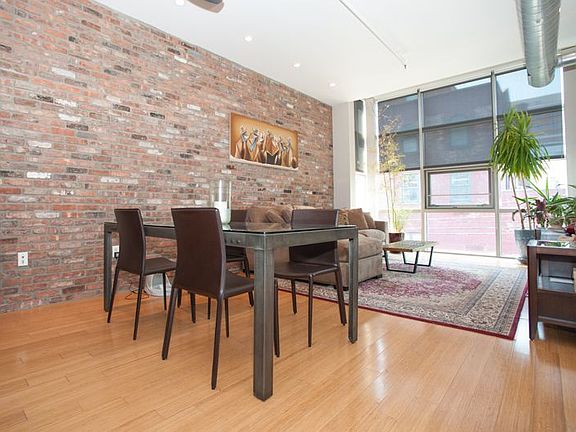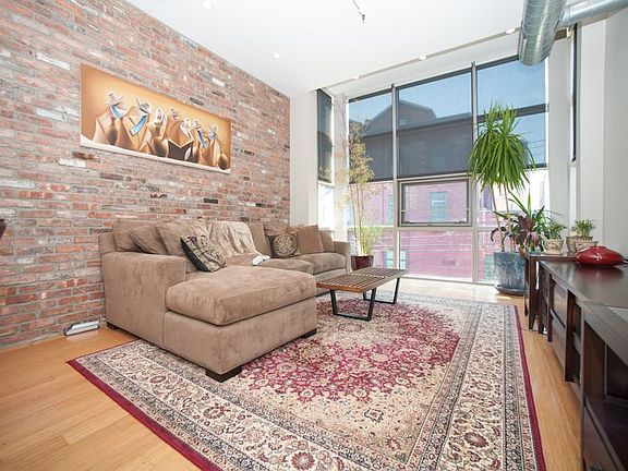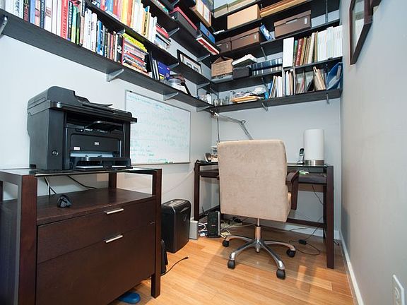 Loft-like 1 Bed & 1 Bath featuring floor-to-ceiling windows facing south with views of a tree-lined street. Energy efficient central air & heat. 10 foot ceilings, exposed brick, recessed lighting, bamboo floors, ample storage space, LG Washer & Dryer and a large bedroom with walk-in closet. Separate office area with built-in hardwood shelving. Chef's kitchen with stainless steel appliances, custom cabinets, and granite countertops. Oversized, spa-like bathroom with radiant floor heating, natural stone tile.