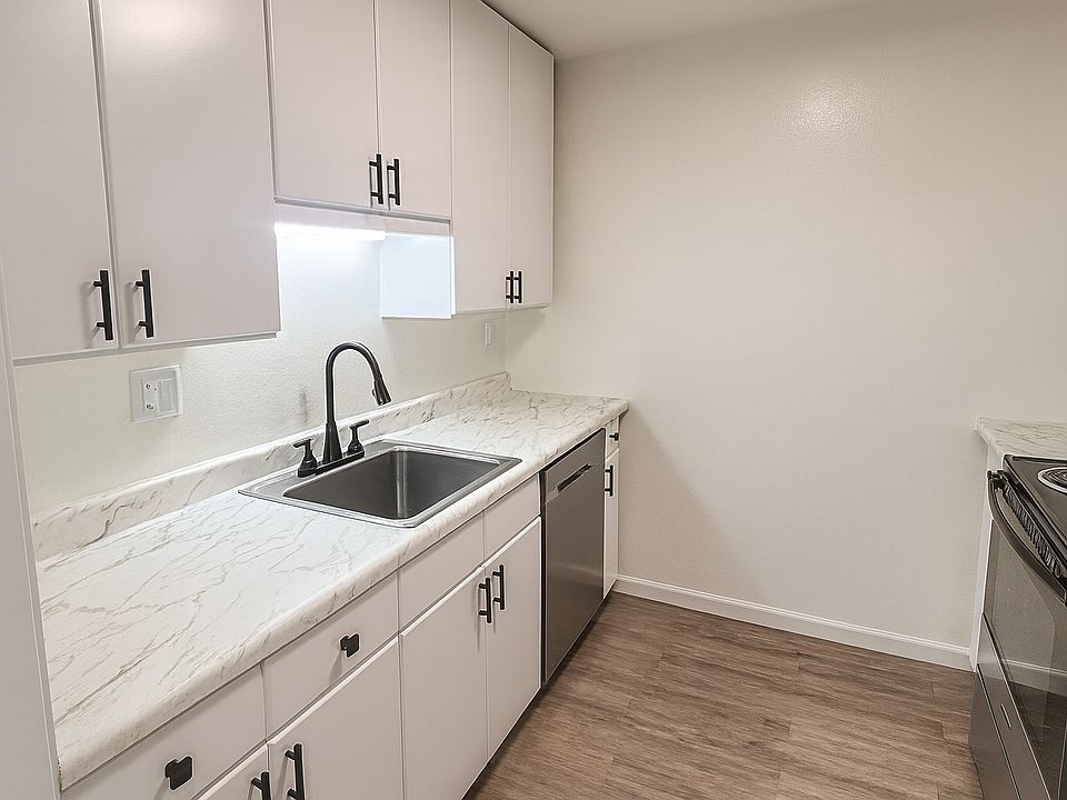 Welcome home to a freshly remodeled 2-bedroom with a bright, airy feel, hardwood floors, and a smart, space-maximizing layout. The modern kitchen showcases stainless steel appliances (dishwasher, oven/range, refrigerator), garbage disposal, and clean, contemporary finishes. Dual-pane windows and abundant natural light make everyday living comfortable and inviting. Step outside to a shared backyard and courtyard/BBQ area, and enjoy everyday convenience with a large, clean, on-site laundry room.