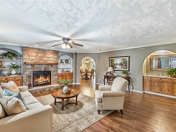 The living room features a stacked stone wood burning fireplace, custom built ins, and warm wood cabinetry. Arched openings connect the living room to the dining area and kitchen, creating a comfortable and easy flow. A built in wet bar adds convenience for gatherings or daily use.