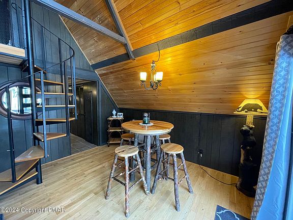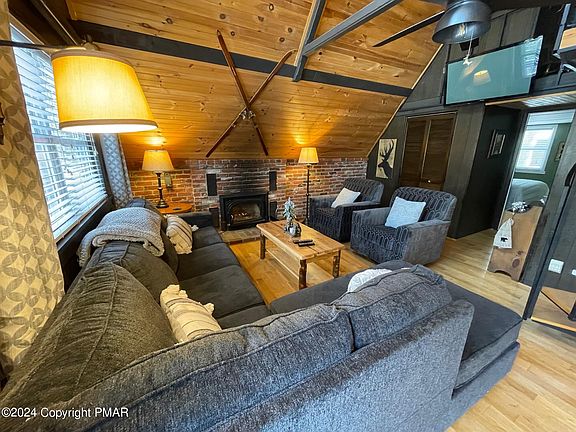 HIGHEST & BEST DUE BY 5PM 2/26/24. MOVE RIGHT INTO THIS UNIQUE CHARMING CHALET HOME! Located In The Heart Of The Pocono Mountains, This Home Features 2 Bedrooms, 1.5 Baths, Large Living Room With Wood Burning Fireplace To Stay Cozy In The Winter Months And The Tongue-In-Groove Ceilings Contribute To The Rustic Charm. The Family Room, With Its Free-Standing Fireplace and Additional Half Bath, Is A Great Space For Relaxation and Entertainment. The Updated Kitchen and Baths Are Significant Improvements, Enhancing Both The Functionality And Aesthetics of the Home. Newer Roof, New Siding, And Cobble Stone Chimney. Don't Forget The 2 Car Garage And The New Expansive Deck Is An Excellent Addition, Offering Outdoor Space For Leisure, Gatherings, Or Simply Enjoying The Natural Surroundings.