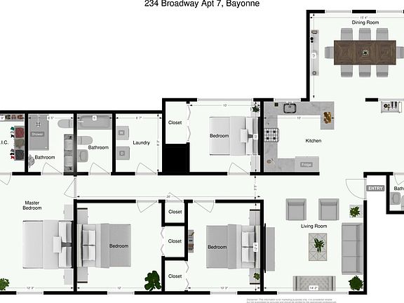 Spacious 4bd 2 full baths apartment on a 2nd floor for rent in Bayonne. All bedrooms are separate and fit queen size beds. Open concept kitchen and a big dining area with a huge balcony. Master bedroom is massive and is complemented with a walk-in closet and ensuite bathroom. Laundry room in the apartment. CENTRAL HEAT AND A/C. Hardwood floor. Big space for big families! House is conveniently located near light rail train station, bus stops, near many restaurants. No pets allowed. TENANTS PAY: $2,300 - 1st month rent $3,450 - security deposit $2,300 - BROKER FEE PAID BY THE TENANTS