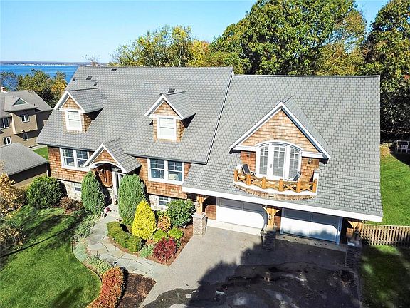 Wonderful shingled contemporary with fabulous water views of the West Passage of Narragansett Bay, and stunning sunsets. This home was completely renovated and expanded in 2010, and has undergone numerous improvements by current owner including: new kitchen with concrete counters,stainless appliances, built-in espresso machine, wine cooler, Control 4 Smart Home electronic controls for lighting,audio/video, etc.A expansive and private rear patio offers outdoor kitchen, w/firepit,and hot tub. The expansive master bedroom with private balcony overlooking the bay,sitting area w/gas stove, 2 walk-in closets and oversized master bath with jetted tub, and separate shower.There are two additional guest bedrooms, and total of 3 1/2 baths. The upper level/loft space offers a billiard room with views down the bay. The finished lower level offers a media room, work out area, spacious mudroom, and small office. The oversized 2-car garage is heated. The landscaping is accented by stone walls/pillars, spacious patio, irrigation system, and more.