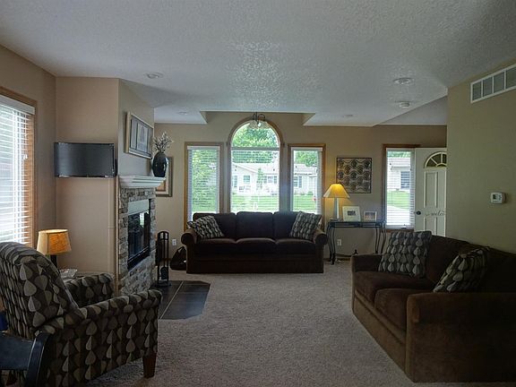 Exceptional 1 1/2 story home in Country Club Circle. Neighborhood park across the street. Three large bedrooms in loft style second story with open staircase and balcony overlooking living room. Formal living room features updated gas fireplace! Sliders to second level deck, eat-in kitchen with stainless steel appliances add modern feel to cozy kitchen, small island. Half bath off kitchen with laundry. Master bedroom suite above garage with large closet and 3/4 bathroom, second level also has a full Hollywood bath with 2 nice sized bedrooms. Non conforming bedroom or office in basement level, family room with walkout to lower level patio. Nice corner lot with swingset. Two car attached garage with room for storage. Home has great curb appeal. New roof in Fall of 2015 and new furnace Spring of 2015.