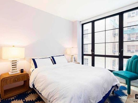 Gramercy area brand new 2 bedroom / 2 full baths South Facing and Quiet Home. Looking down to private courtyard. Apartment 3C is a beautiful two bedroom, two bathroom apartment floor-to-ceiling, industrial style, square casement windows framing iconic, sweeping Manhattan views. Solid white oak floors work in concert with the windows to create a light and airy, warm, natural atmosphere. Entrace leads to the loft-like open living/dining room where functionality and beauty tie together seamlessly in the design of the kitchen with a unique, movable island, white quartzite countertops, silver travertine backsplashes and open stainless steel shelving. The kitchen features professional grade appliances, including an integrated Sub-Zero fridge/freezer, a Bertazzoni oven and gas cooktop, a GE microwave and Bosch dishwasher. The apartment also has a Bosch washing machine and dryer. The master bedroom offers a large walk-in closet and a a luxurious en-suite bathroom with elegant shower surround of framed casement glazing, custom patterned stone tile floor, performance polished chrome Waterworks fittings and a custom made vanity with double sinks crafted with Carrera marble. The walls are clad in a coordinated limestone. The second bedroom also has its own bathroom, featuring a custom floor tile pattern and a lacquer and Carrera stone vanity.