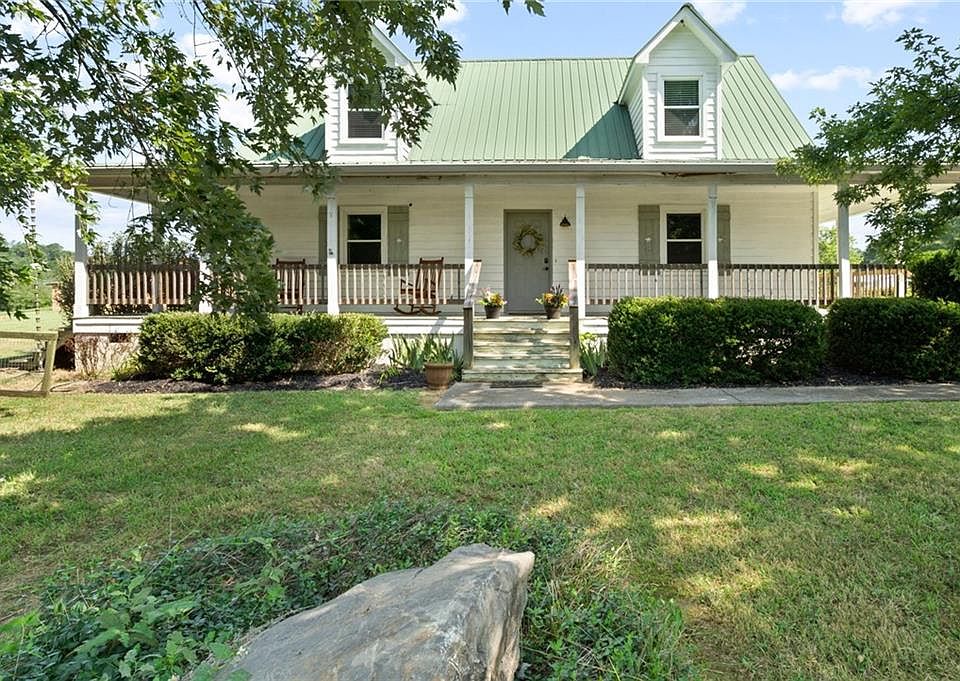 Picture perfect farmhouse nestled on nearly 38 acres of exquisite land with expansive views of the one-of-a-kind property. Eye catching 80'x80' barn has electricity, water, a tack room, and potential to easily add stalls. The lot includes 4 ponds, one of which is over 2 acres in size, spring fed, stocked with bass, trout, carp and blue gill. Large enough for fishing, kayaking, paddle-boarding, etc. Entire property is fenced and cross-fenced with 5 hay producing pastures, ready for your horses or cattle. Riding ring/corral and two shade structures. Enjoy seasonal pickings from your fig, peach, apple, and pear trees, as well as blueberry and blackberry bushes. Large fire-pit for family gatherings. Property has 4 yard hydrants and could easily be used as a working farm or enjoy as your personal hobby farm. The 3 bedroom, 2-bathroom home has been updated with hardwood floors, gas fireplace in living room, farmhouse kitchen with stainless steel appliances and double ovens. This unique property is the ideal mix of cozy farmhouse yet the bedrooms are oversized to accommodate many guests. Main floor has primary bedroom with sitting area, built in bookcases, large walk in closet, and primary bathroom. The second floor has a full bath and two huge bedrooms that can sleep up to 8 people. Built in bunk beds with lighting are perfect for children and visitors alike. Enjoy morning coffee on your front porch or relax on the wrap-around porch, watching ducks in the pond from the rear swing. Great home for entertaining and enjoying the serenity of nature. Location is private yet close enough to many outdoor activities; Carter's Lake is a short 5-minute drive. Fort Mountain State Park is 20 minutes away. So many possibilities here; full time farm property, event venue, vacation property, all within 60 miles of Atlanta. Click on virtual tour links to view videos for more detailed property views.