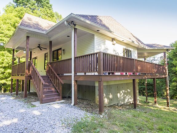 Gorgeous panoramic Smoky Mountain type views from the front porch of this hilltop estate. 2 laundry rooms! Shed building with water & electric! Geothermal heat & air. Safe room in basement can also be used as third bedroom. MUST HAVE 4x4 OR FRONT WHEEL DRIVE VEHICLE TO REACH HOME.