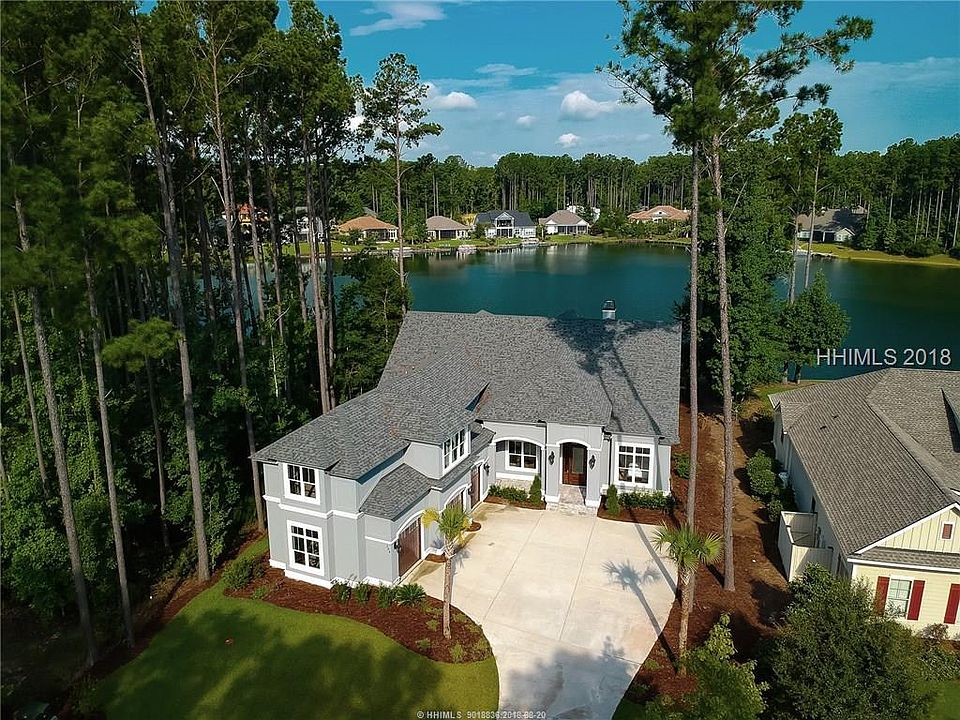 EXPANSIVE LAKE FRONT HOME! Incredible sunset views over the water. Private dock w/water/ electricity, kayak slip, outdoor shower & screened porch. This is Lowcountry living! The open plan is packed with luxury: coffered ceilings, Porcelain tile, built-ins, marble fireplace - too much to list! Large, open kitchen has Wolff & Bosch appliances, a large contrasting island, granite and modern tile backsplash. The main level owner's suite features a Carrara marble bathroom. Large balcony off bonus rm, & office/Bed 4, enjoys the lake view. You'll love the convenience of the insulated walk-in attic over the 3-car garage and proximity to back gate.