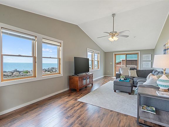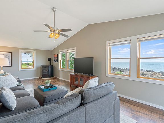 Summer awaits! Remodeled year-round lakefront home on a quiet street. Enjoy the stunning sunsets from the living room, dining room and the primary bedroom or out on the back deck that was added in 2014. 50ft of water frontage with views of the Oswego Harbor. The kitchen has been updated with new flooring and modernized touches. The kitchen is open to the large dining room. The living room offers vaulted ceilings and a pellet stove that is perfect in the winter months. There are 2 generous sized bedrooms. The primary bedroom offers a full bath and 2 walk in closets. Outside you'll find a 2.5 car garage with a concrete floor, plenty of space for cars, storage etc. There is also a finished loft area upstairs and more storage on the 2nd floor. Also included on this property is a mobile home in need of some updates. Once it's repaired and updated, it will offer loads of potential for guests or extra income, it was previously used as a long-term rental. This home has the option to be purchased furnished! It's a great location, close to the city of Oswego, Suny Oswego, many shops and restaurants, Novelis and the Nuclear Plant.