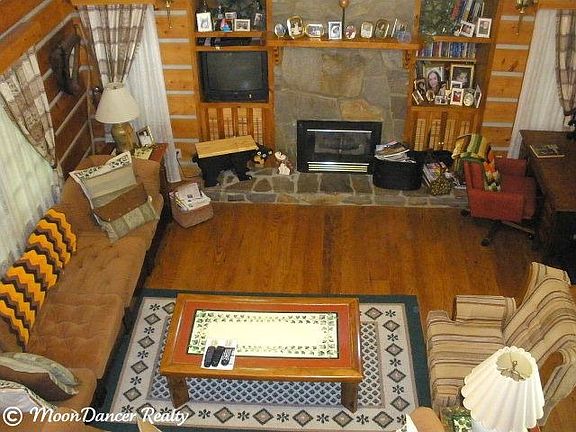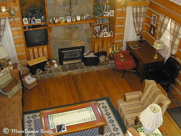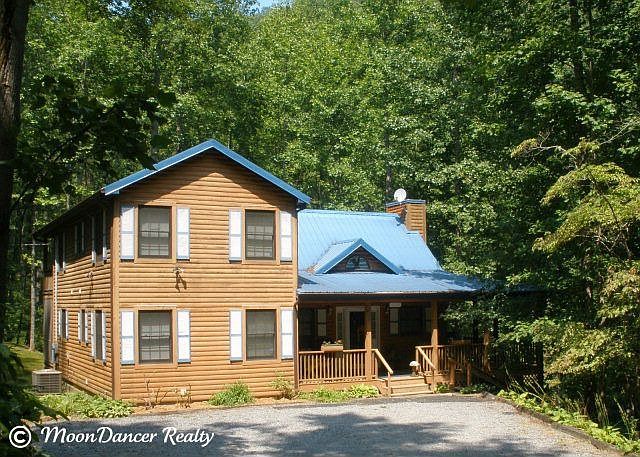 Greens Creek area of Sylva. Perfect Large Log Cabin for friends and family gatherings. Big comfy wraparound covered deck plus screened in porch area makes for lots of outdoor living space. Huge great room with ample room for plenty of seating, quality built in shelving surrounds the native rock ceiling high fireplace, hardwood floors and vaulted ceilings. Kitchen has two eating areas, center island, smoothly finished brick flooring, opens to screened porch, pantry and plenty of cabinets. Master suite on main floor, two bedrooms on second floor (one with balcony) plus additional sleeping area in basement. Gorgeous wooded lot with stream and waterfall for serene outdoor surroundings.