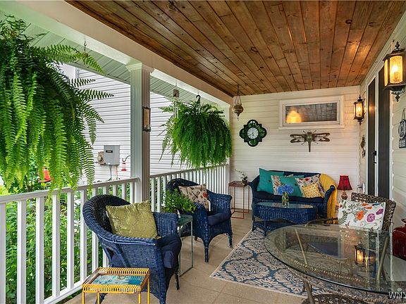 The kitchen boasts stainless steel appliances, a gas range, a butcher block island, and a beautiful wet bar, all opening onto a cozy side porch through elegant double doors. The bathrooms are tastefully updated, and the spacious bedrooms provide comfort and tranquility.
