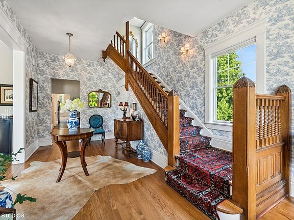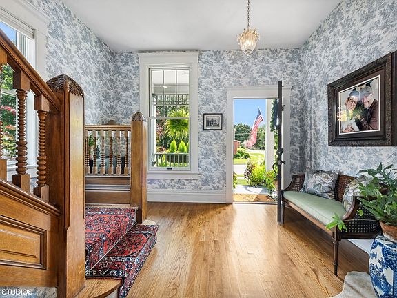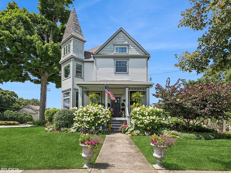 234 N Plum Grove is arguably the most recognizable and beloved home in Palatine. Built in 1885, restored in 2014, lovingly upgraded and enhanced by the current owners, this remarkable Victorian combines classic architectural beauty with modern updates and conveniences today's buyers expect. The first thing you'll notice is the oversized lot featuring lush gardens and towering trees. The charming front porch, flanked by hydrangea, is the perfect place to watch the sunrise and offers endless opportunities for holiday and seasonal decor. Upon entering the home you're greeted by 10' ceilings, beautiful oak flooring, Swarovski crystal chandeliers and the breathtaking original, hand-carved banister. Discerning buyers will appreciate the painstakingly preserved original woodwork, banisters, doors, hardware and transoms throughout the home. Oversized south facing windows in the living room and family room ensure the home is flooded with natural light all day. The gas fireplace features the home's original 1885 mantel and mirror. A chef's kitchen has everything today's cook wants including an eat-in island, walk-in pantry and double-oven. Marble tile backsplash, farmhouse sink and slate tile floors add to the charming sophistication. On the second floor you'll find a spacious primary suite with two walk-in closets and a spa-like bathroom with a show stopping free-standing tub. Down the hall are two additional bedrooms with generous closet space and full bath. A spacious, oversized laundry room on this floors offers the ultimate in convenience. The third floor features an amazing loft space, full bath and another bedroom. This is the perfect area for guests or a teenager's suite. The basement was excavated and finished off during the renovation providing a new foundation in addition to ample additional living space and storage. You simply will not find this much storage in any other home of this era. And don't forget the award-winning gardens and fully fenced backyard. With a built-in fireplace, surround sound speakers and in-ground sprinkler system this yard is an entertainer's and gardener's dream. Located in the heart of downtown Palatine you will enjoy everything this vibrant neighborhood has to offer. The Metra station, coffee shops and cafes, shopping, restaurants and bars are all just steps away. Watch the 4th of July fireworks from your front yard and walk one block to watch the parade. This home offers unparalleled charm, elegance, location and convenience.