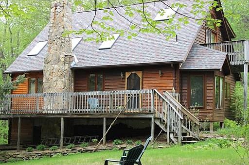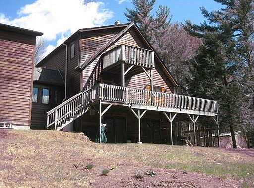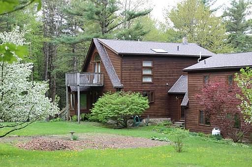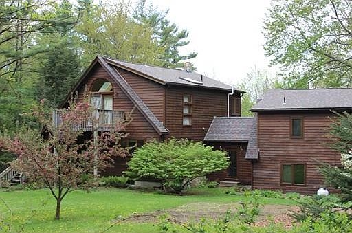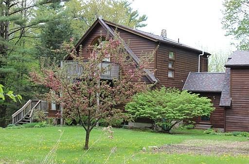 Beautiful location! Motivated Seller! This lovely 3 bedroom, 2 ½ bath Contemporary Cape style home is situated on 5.5 wooded acres. Kitchen w/custom cabinets & built-ins, opens to dining room w/bow window & access to wrap around deck, living room w/stone fireplace, skylights and ceiling fans on the vaulted ceiling, 1 bedroom on the 1st floor & a full bath. 2nd Floor has a master bedroom suite w/walk-in closet, skylight and balcony. 3rd bedroom does not have a closet, but has a small loft and balcony. Studio space above 2 car garage has it's own entrance a ½ bath,and a pellet stove. Full basement w/sliders to backyard. This home is sunny, warm and inviting. The yard is large with a established organic garden. There is a outdoor pizza oven, picnic area in the woods, a large shed, young high bush blueberries & many perennials. New roof, wood burning furnace as well as gas furnace. Close to Rt. 63 & minutes to I-91 and Rt. 2.