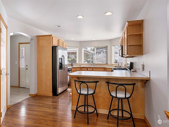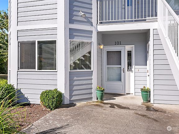 Elevate your lifestyle with this spacious, single-level luxury condo, nestled in a serene Bellingham location.Boasting 2 bedrooms, 2 full baths, home features a large living room with a gas fireplace and a kitchen with hardwood floors and stainless-steel appliances, and brand new fridge.The primary bedroom suite impresses with a walk-in closet & a master bath offering double sinks, a jetted tub, & a separate shower. Large laundry room comes with full size washer & dryer.Enjoy the outdoors on the darling patio bordered by trees, ensuring road privacy.This unit has 2 parking spots (1 under carport).HOA dues include water, sewer & garbage! Nestled conveniently close to amenities and shopping, this condo embodies both comfort & convenience.