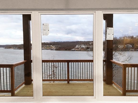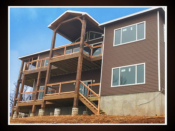 NEW GATED LAKEFRONT CONSTRUCTION WITH A BIG VIEW! Come see this 5 bedroom, 3.5 bath home in the private, gated River Oaks Community. Plenty of room for a dock with 120 ft of Lakefront. The exterior of the home features 10"x10" wood beams, Notty Alder Solid Wood double front door, textured driveway, level lakeside yard with almost no steps to the dock, screened porch and covered deck with wood ceiling. Inside you'll enjoy the double sided gas fireplace, granite countertops in kitchen and baths, large master shower with dual showerheads, low profile pocket sliding doors for pantry and dual master closets, family room with wet bar on lower level and huge kitchen with big island workspace. Enjoy the expansive lake view from most every room in the house. Large windows bring in lots of natural light. Electric for the dock and dock piers and pocket are installed and dock ready. This gated community is intimate, quiet and is close to restaurants by land and by boat. Schedule a showing today!