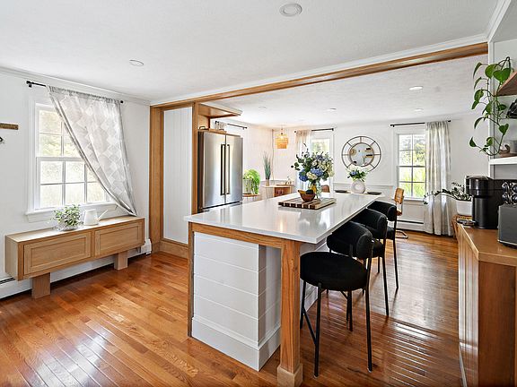 Nestled along desirable and picturesque Route 6A, this East Sandwich home has been thoughtfully designed and renovated for contemporary living and entertaining alike. The heart of the residence is an open-concept chef's kitchen, featuring a large center island, custom cabinetry, and built-ins such as a coffee bar, pantry, and laundry closet. Custom finishes and millwork showcase the attention to detail throughout. A spacious front-to-back living room with a fireplace and a full bathroom complete the first floor, while upstairs, find three bedrooms and a full bathroom with new tile, vanity, and beadboard. Enjoy outdoor living on the deck or patio, or refresh in the outdoor shower after a day at the beach. Ideally situated, this home provides easy access to the Cape's historic villages, beautiful beaches, scenic marshes, and quaint shops. Whether as an investment or full time residence, experience the best of Cape Cod living in this exceptional turnkey property.