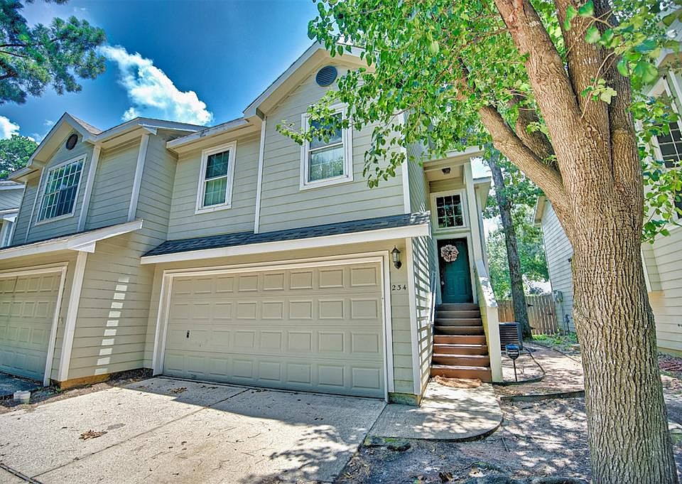 Completely Renovated Townhouse in the Heart of The Woodlands. This stunning townhouse offers a perfect blend of modern updates & a convenient location. Step inside to a light-filled living area featuring beautiful laminate flooring throughout the downstairs. The recently renovated kitchen boasts a bright and inviting atmosphere. Upstairs, the primary bedroom includes a luxurious walk-in closet and a spa-like bathroom with a rain shower and dual vanities. The secondary bathroom features a jetted tub and modern fixtures. Enjoy outdoor entertaining on the private deck and appreciate the peace of mind with a recently replaced roof, A/C, windows, and water heater. The two-car garage offers ample storage with custom cabinets, and the community provides a pool and walking trails for your enjoyment. This move-in-ready gem even includes a stainless-steel refrigerator. Don't miss out on this opportunity to live in a beautiful and updated townhouse close to everything The Woodlands has to offer!