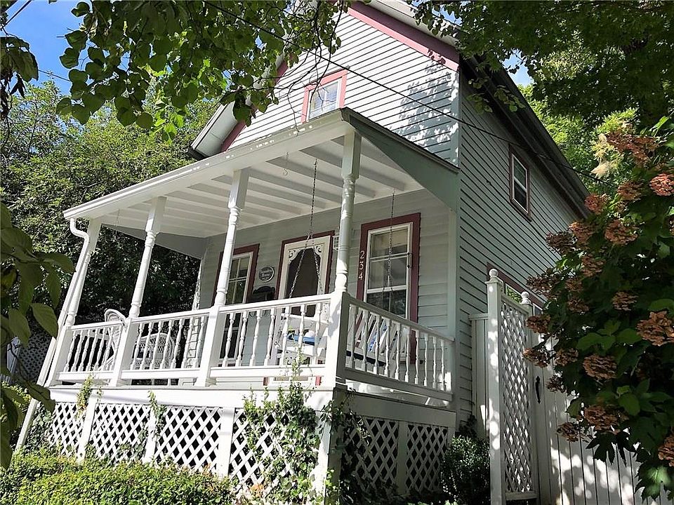 Some of the best things come in small packages and that is absolutely the case with this stunning Victorian cottage. The inviting front porch overlooking Spring Street provides the first hint of a relaxing atmosphere and it extends into the sunny living room with a picture window and beautiful hardwood floors. The adjoining kitchen boasts cherry cabinets and black granite counters. A door opens onto a covered side porch and a stone patio for outdoor grilling. Hardwood floors continue into the spacious master suite. The tiled master bath with a shower and a utility room complete the main level. Family and friends will enjoy the upper level family room, guest bedroom and a full bath with a jetted soaking tub. The back door opens to a wonderful back yard that begs you to stay with terraced gardens, native stone walls, a pergola, a Hartley Botanic Victorian Greenhouse with roof cresting and finials, a wooden deck and a decorative privacy fence. The home's gardens have been featured in national magazines and on the Preservation Society Spring Garden Tours. The home was on the 2019 Preservation Society Christmas Tour of Homes. Easy walk to downtown.