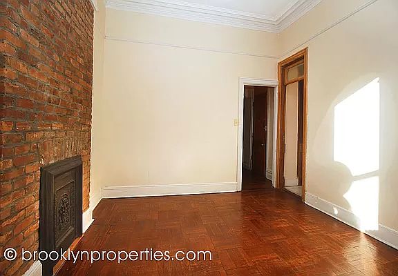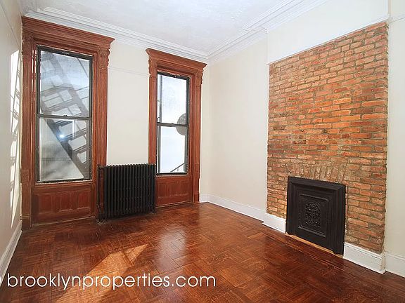 Spacious and bright loft-like parlor floor in authentic 1889 brownstone row home, with high ceilings and natural light pouring in from five tall windows. Entry foyer with two closets leads to 13 x 12 living room alongside 13 x 8 eat-in kitchen with full stainless steel appliance package: 30" 5 burner gas range, 14 cubic foot fridge, and brand new full size stainless steel dishwasher. Plenty of wood cabinets and new stone counter, ceramic tile back-splash, and tile floor. Bedroom is completely separate, measuring 12 x 18: large enough for a king or queen, 2 dressers, and additional furniture. Double closet in the bedroom with overhead storage, and original window shutters in good working condition provide maximum privacy. White tile bath with newly re-glazed cast iron tub, modern shower-head, pedestal sink, ceramic towel bar, and built in storage. Bath centrally located so no one need walk through your bedroom to use the bathroom! Parquet floors throughout, exposed brick and decorative exposed brick in living room. Ceiling fan light fixtures front and rear add to the light airy ambiance! A gardener's delight, steps from community garden corner of Vernon Avenue and Throop Avenue. Front windows have window boxes newly planted with Sedum. Rear windows view onto bucolic butterfly garden. Please note STRICTLY NO SMOKING AND NO PETS! Move in December 1 or sooner. Welcome home!