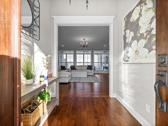 This impeccable brick home offers a seamless blend of luxury and functionality throughout. Hardwood and tile flooring, along with 10-foot ceilings, create a spacious and elegant ambiance. The chef's kitchen is a highlight, featuring a sizable 6x9’ island, a gas cooktop, pot filler, and a combination of marble and quartz countertops. The immense prep space and walk-in pantry make it a dream for culinary enthusiasts. A spacious bonus room adds flexibility to the layout. The primary suite is a retreat with a freestanding tub, walk-through shower, marble tile, and separate sinks. The large laundry room ensures practicality with ample storage. Outdoor spaces include both covered and open patios, complete with a fireplace, creating a perfect setting for relaxation and entertainment. This home truly shows beautifully, combining aesthetic appeal with thoughtful design elements.