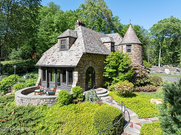 Discover this enchanting French Normandy style stone and brick home, nestled on 3 private acres, with a tennis court, pond, oversized pool, and a charming bridge over a flowing brook. Step inside to find a gracious living room, featuring a stone fireplace, and access to a four-season room with a quaint patio overlooking the pool and pond. The formal dining room is adjacent to the eat-in kitchen, which leads to a patio, and also to a staircase to the family room with high ceilings, and to a deck overlooking the tennis court. The second floor offers three bedrooms, including a primary suite with a unique bathroom within the home's turret. Located less than an hour from NYC, with quick access to downtown Stamford, this home provides an idyllic country escape with city conveniences!