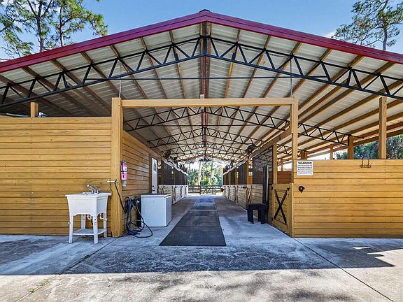 The equestrian infrastructure is designed for ease, safety, and efficiency. The 9-stall center-aisle barn features 12+u14 matted stalls, each with a direct runout, excellent ventilation, durable metal roofing, mounted aisle fans, and wide walkways for grooming. Directly adjoining this setup is a separate 1-stall house with its own individual paddock, ideal for specialty housing and a practical solution for a stallion or any horse requiring a private turnout arrangement. A private A/C tack room provides washer, dryer, bathroom, 14 saddle racks, and a refrigerator. A dedicated feed room, double wash racks, manure pit, and trailer parking support a complete working program. Multiple shaded holding areas and an additional stall structure increase flexibility for rotation and management. A Gator is available for use as part of the rental.