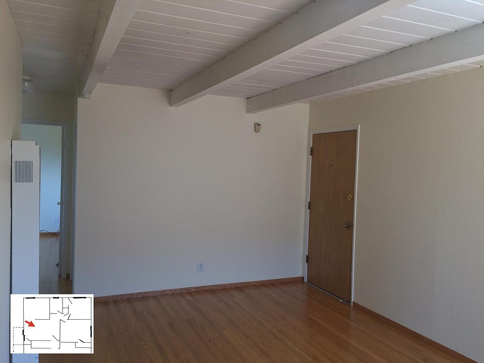 Grant St near Bancroft. This is a great Berkeley neighborhood, close to downtown, theaters, restaurants, BART and buses. Convenient to University Avenue, Shattuck Avenue, and UC Berkeley campus. This apartment is on the second floor behind another unit, sheltered from street sounds. It has beam ceilings throughout and nice light. It has a kitchen large enough to eat in, which is open to a nice sized living room, with a useable south facing balcony deck off the living room. The living room and bedrooms have real hardwood floors, the kitchen has vinyl flooring, and the bathroom has a tile floor and tub surround. Natural gas heater. There is a coin operated laundry on the property. It is available for rent now. Please call or text if you have questions. We have two videos that I can forward to you to do a virtual tour. Initial term for the lease is 1 year. After that it converts to month to month. There are no screening / application fees. There is one off street parking space for the unit. Trash pickup is included. Tenants pay all other utilities. Smoking is not legal in Berkeley multi-family buildings.